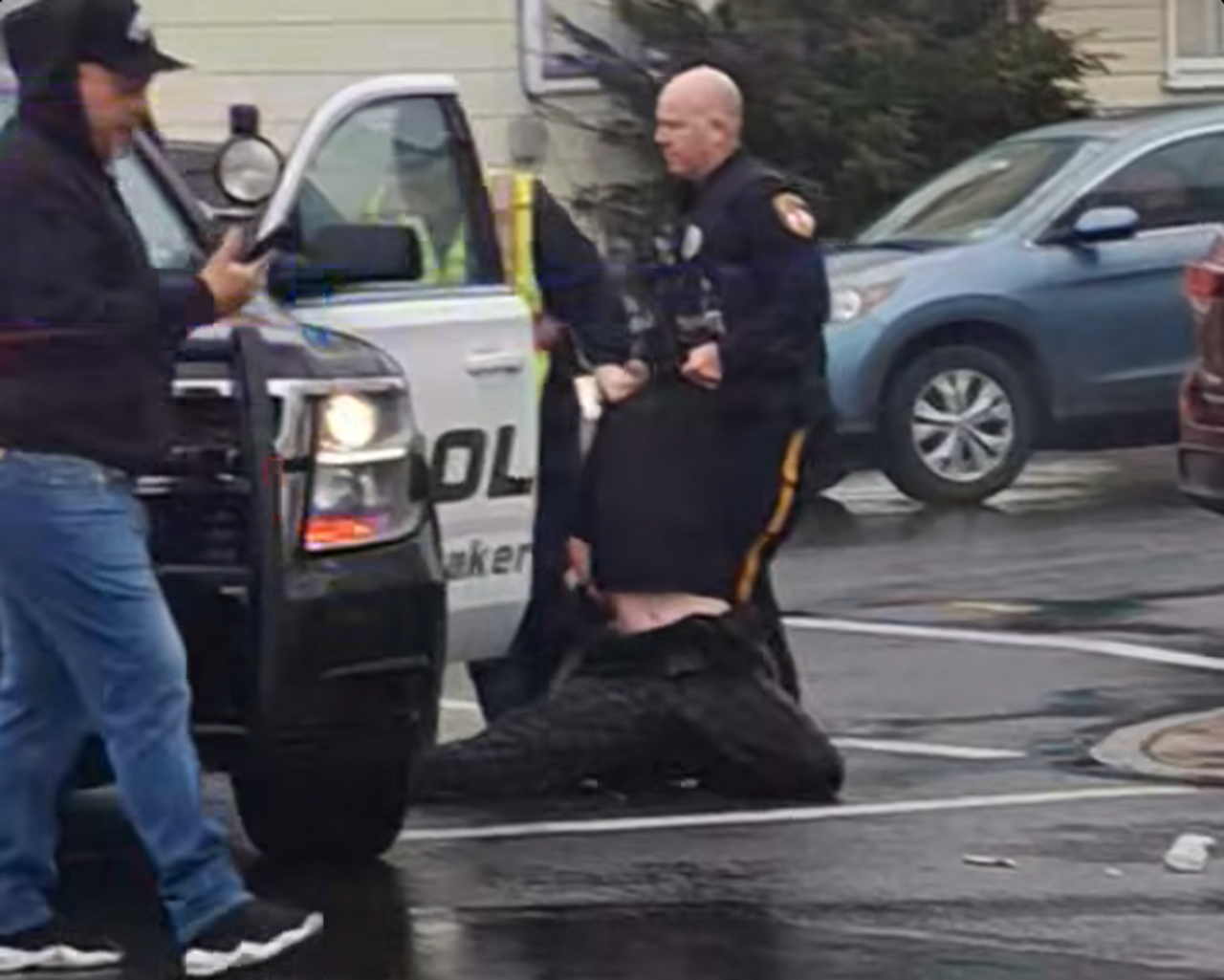 Quakertown police grab a handcuffed student by the shirt before shoving him belly first into the back of a police SUV after attacking a student-led anti-ICE protest in Quakertown, Pennsylvania, February 20, 2026. [Photo: David Stubanas]
