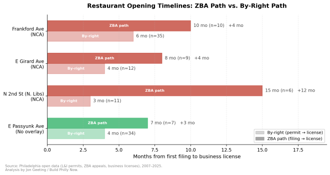 The pattern holds beyond Frankford. I compared opening timelines for food and beverage businesses that went through the ZBA against businesses on the same corridors that opened by-right, using the most recent building permit as a starting point for the by-right group: