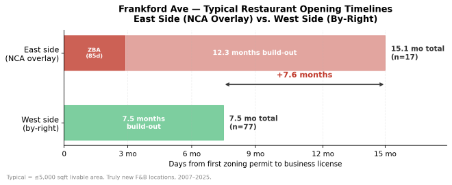 The headline finding: On the unregulated west side of Frankford, a typical new restaurant opens about 7.5 months after pulling its first zoning permit, based on 77 restaurants with matched permit and license records. On the east side, that same restaurant faces about a 15-month timeline. This includes the 7.5 months of buildout, plus a median 85-day ZBA queue before construction can even begin, plus the cascading delays that the uncertainty creates for lease negotiations, contractor scheduling and financing.