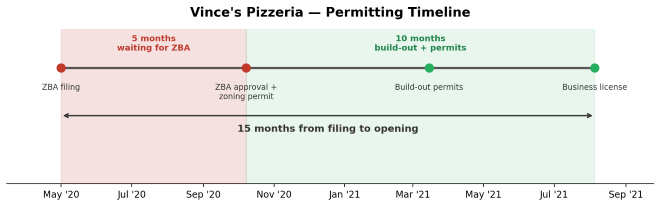 Based on a review of City permits, the whole timeline for the zoning phase of Vince’s permitting journey took about five months — but it took about 15 months between their initial filing and when the City finally issued their business license. Meanwhile, it took only five months to physically build out the space.