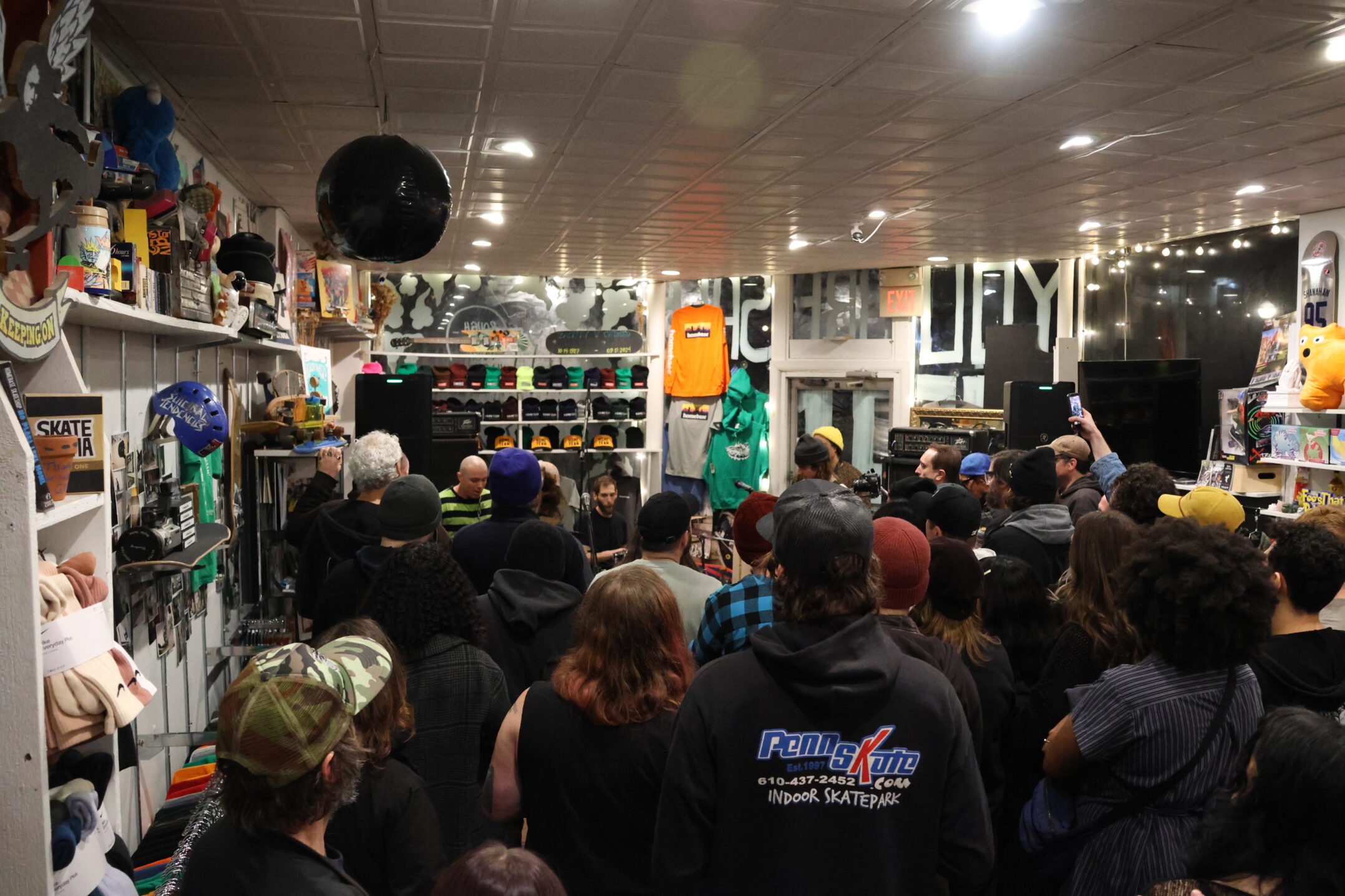 The crowd, full of skaters and non-skaters, wait in packs outside the store, and light cigarettes, shielding the ends from the rain. Others peer through the gaps between the painted flowers on the storefront windows, peeking over rows of hats as the Lehigh Valley alt-rock band Leadpetal tune their guitars.