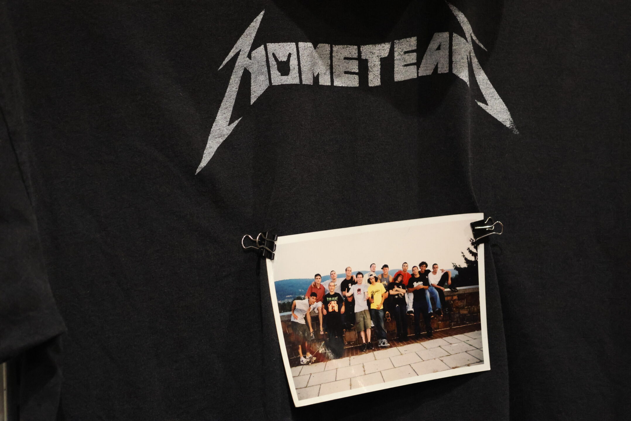 A photo of Homebase Skateshop founder Andy Po and Lehigh Valley skaters sits on a “Home Team” T-shirt. Po said most of the skaters in the photo contributed to “City Without Spots,” the Lehigh Valley’s first skate video. (Luke Kaiser/B&W Staff)