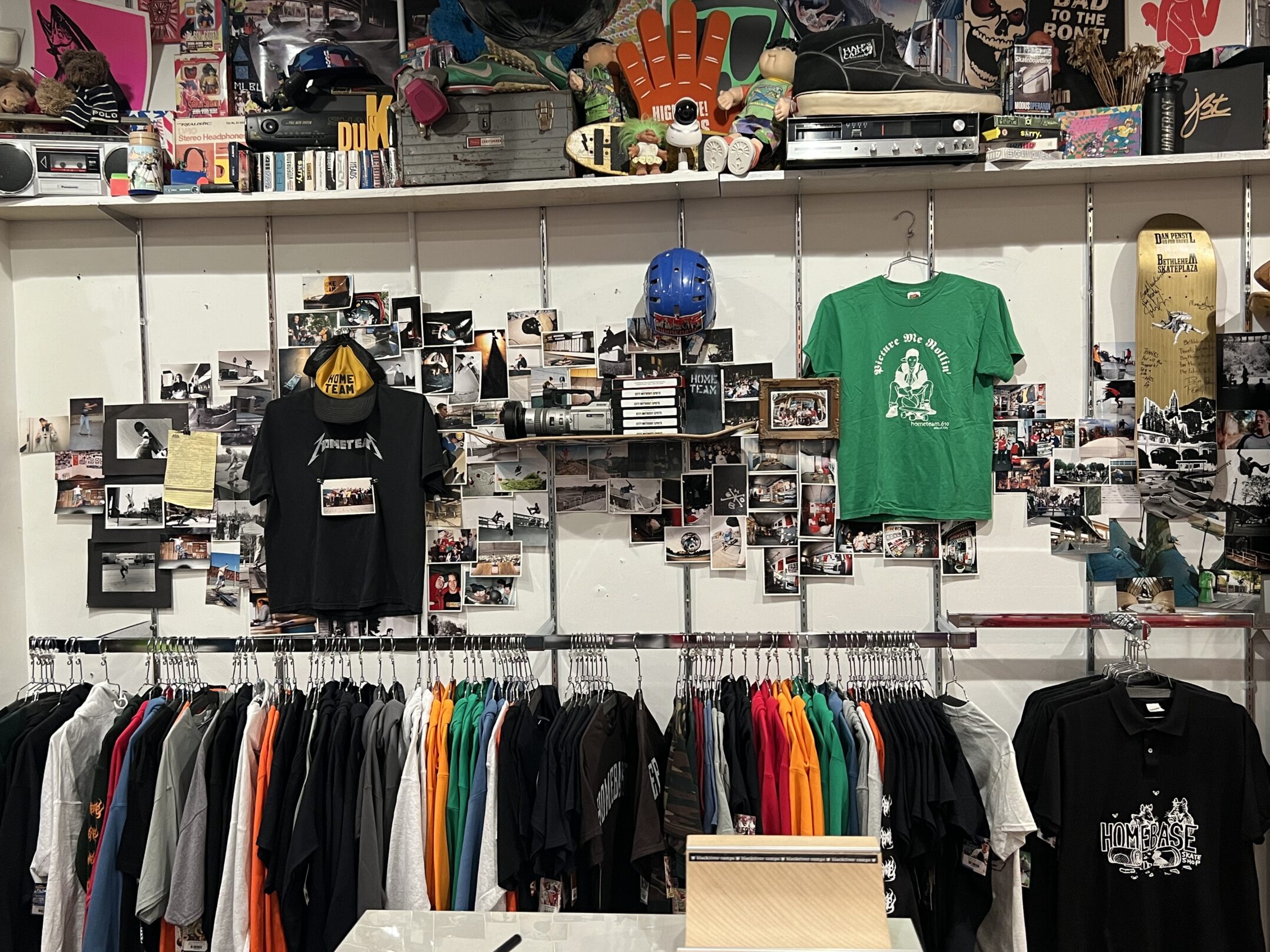 Coined the “Home Team Art Show,” the collage represents Po’s journey with the shop. Beginning with photos from 1997, the year he moved from San Diego to the Lehigh Valley, and culminating in the release of Homebase’s skate video in 2002, which sits neatly stacked next to Po’s Sony VX-2000 camera.