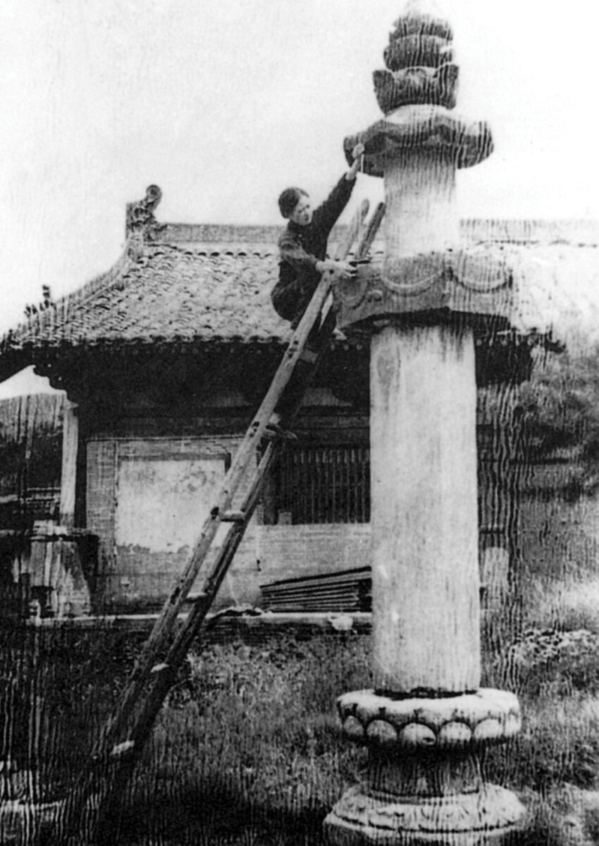 (Above) Lin Huiyin conducting an architectural survey of a stone pillar (jīng chuáng) at Foguang Temple, Mount Wutai, Shanxi, 1937; (below) Commemorative Stamp for the Monument to the People’s Heroes, issued in May 1958.