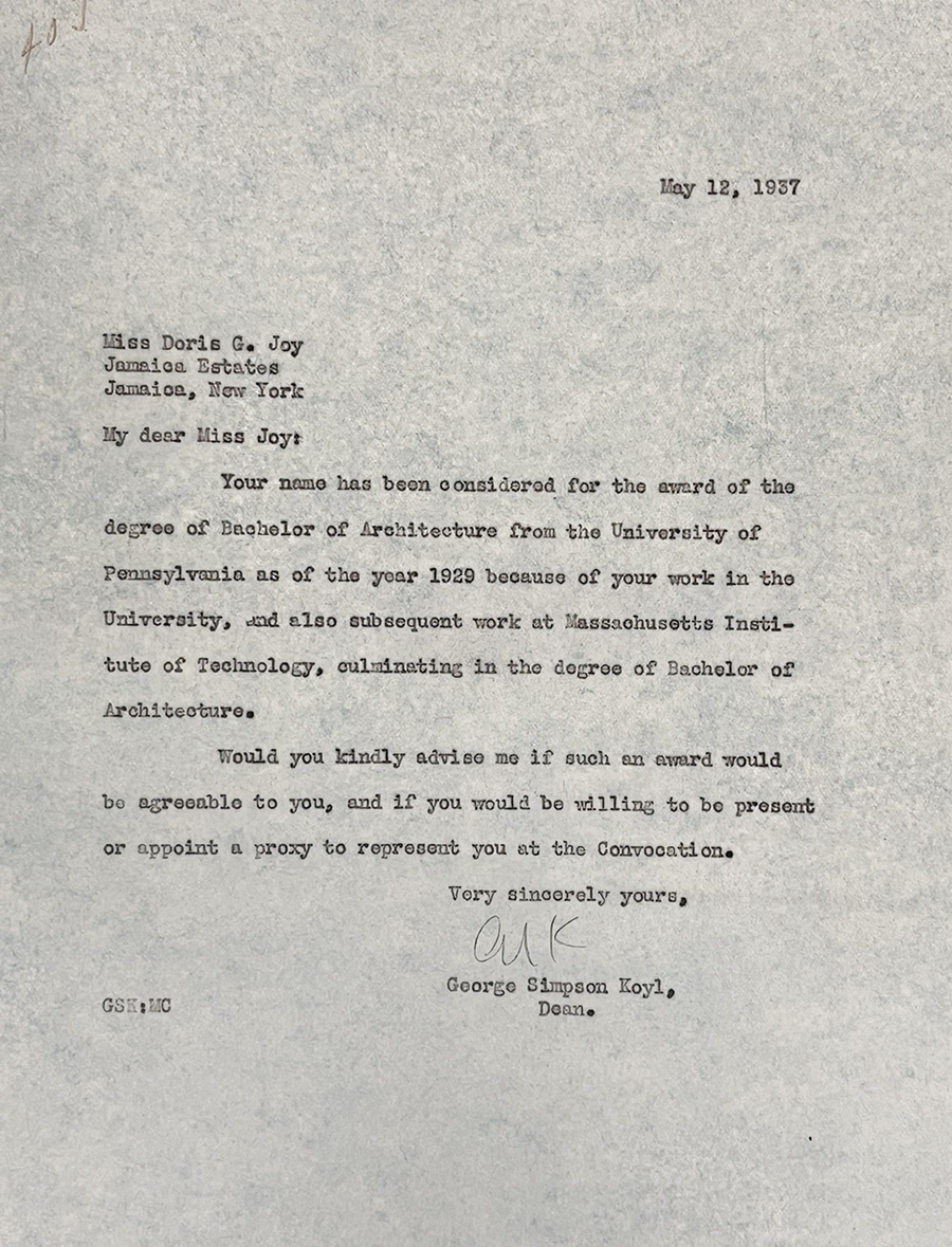 Doris Joy Derbyshire completed 13 courses in architecture and one in landscape architecture at Penn before completing her degree at MIT. In 1937 Penn awarded her a degree in architecture retroactive to 1929.