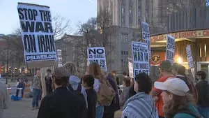 Shouts of opposition filled the plaza as protesters held signs and called for an end to military escalation in the Middle East.