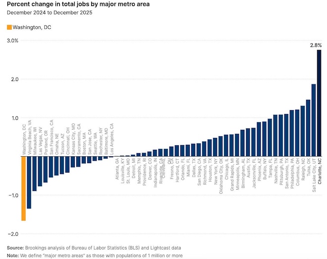 According to a recent Brookings report, the D.C.-Maryland-Virginia region now leads the country in job loss, with employment down nearly 1.7 percent in December 2025 compared to the prior year.