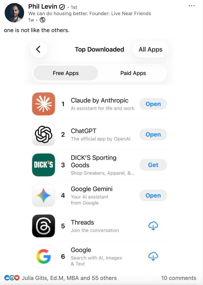 I loved this LinkedIn post by Phil Levin about how Dick’s Sporting Goods is a top downloaded app at the same time as Claude and Gemini.