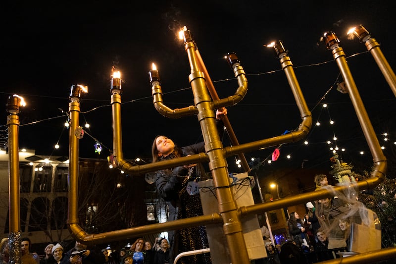 Rabbanit Dasi Fruchter, of the South Philadelphia Shtiebel, lights a menorah during a public Hanukkah celebration and menorah lighting ceremony in South Philadelphia on Sunday, Dec. 5, 2021. Fruchter attended and was ordained at Yeshivat Maharat in the Bronx borough of New York City, and is one of about a half-dozen ordained women who serve Modern Orthodox synagogues across the U.S. | Ryan Collerd, Associated Press