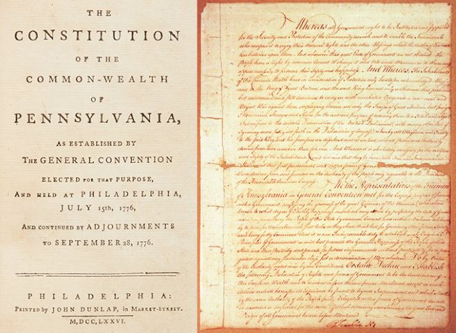 New Hampshire completed theirs first, in January 1776. A handful of other states soon followed including PA in September. Ours was considered wildly progressive, as it guaranteed all tax-paying men the right to vote, even if they did not own property, and called for both a governor-less state administration — opting for an executive committee — and a unicameral rather than bicameral legislature (no separate house and senate).