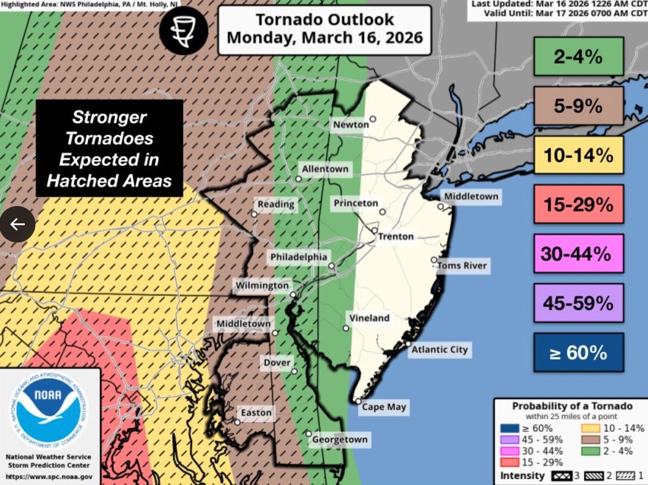 The storms will come with a chance of a tornado, 80 mile per hour wind gusts, downed trees, and widespread power outages, according to authorities. Accuweather warned of the potential for canceled flights at Philadelphia International Airport as well as closed roads impacting traffic.