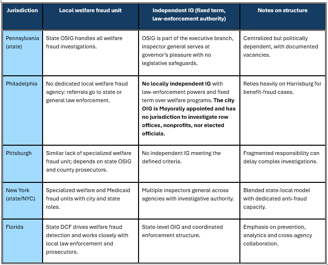 Those concerns are compounded at the local level, where Pennsylvania’s largest cities lack dedicated welfare fraud investigation forces and independent inspectors general with their own law‑enforcement authority and fixed terms that outlast the political administrations that appoint them. Complaints about welfare fraud originating in Philadelphia and Allegheny County must typically be referred to state agencies or general‑jurisdiction law enforcement, rather than to specialized local units trained to investigate benefit schemes.​