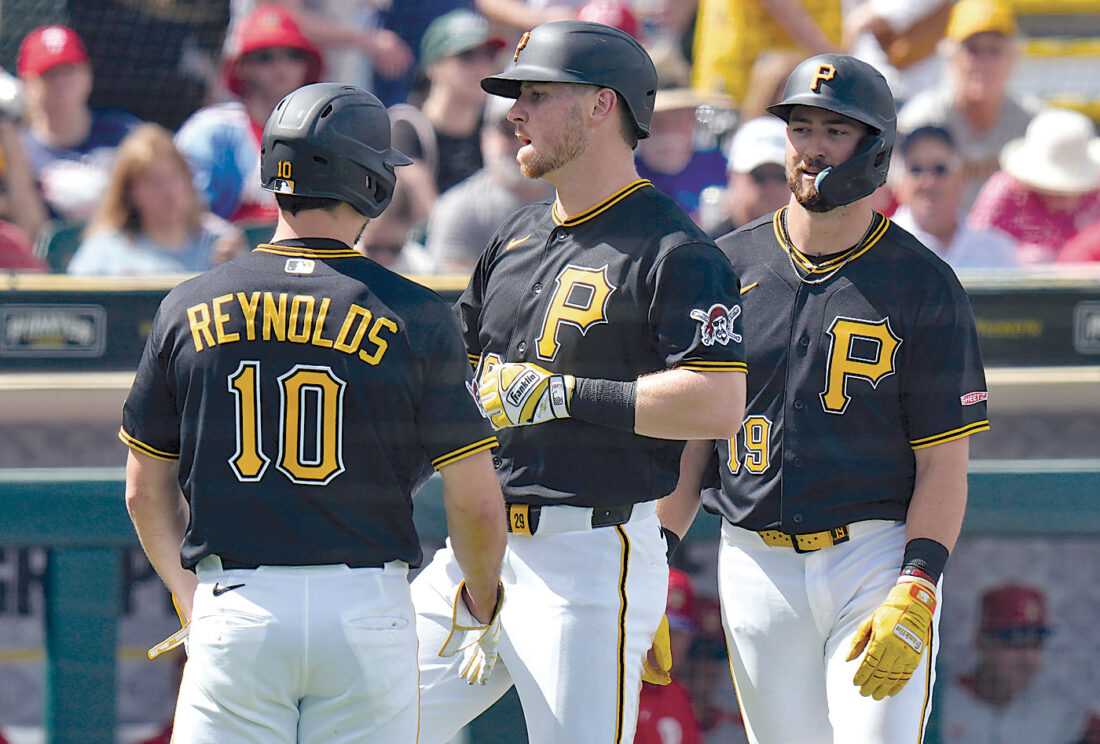 Ryan O’Hearn (center) was added to the Pirates’ lineup that includes Bryan Reynolds (10) and Jared Triolo (19).