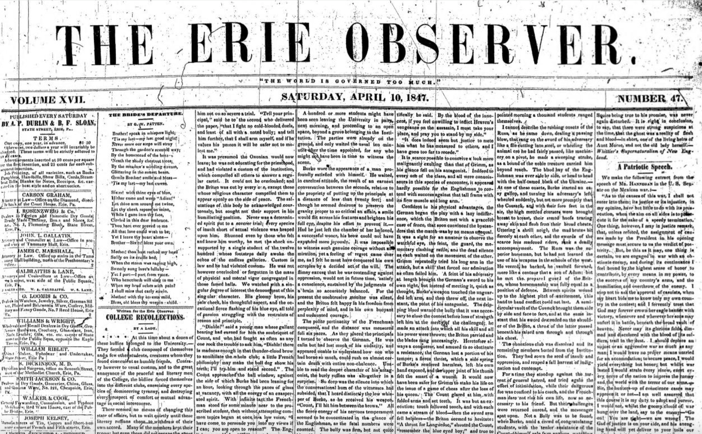 In Erie, Pennsylvania on the eve of the 1860 presidential election, Abraham Lincoln was the favored candidate locally. This was reflected in the coverage within the widely circulated Erie Gazette and Erie City Dispatch newspapers. There was a third well-circulated paper though, the Erie Observer, which represented local opposition, an opposition that was not merely wary of a Lincoln presidency, but outright hostile towards the idea.