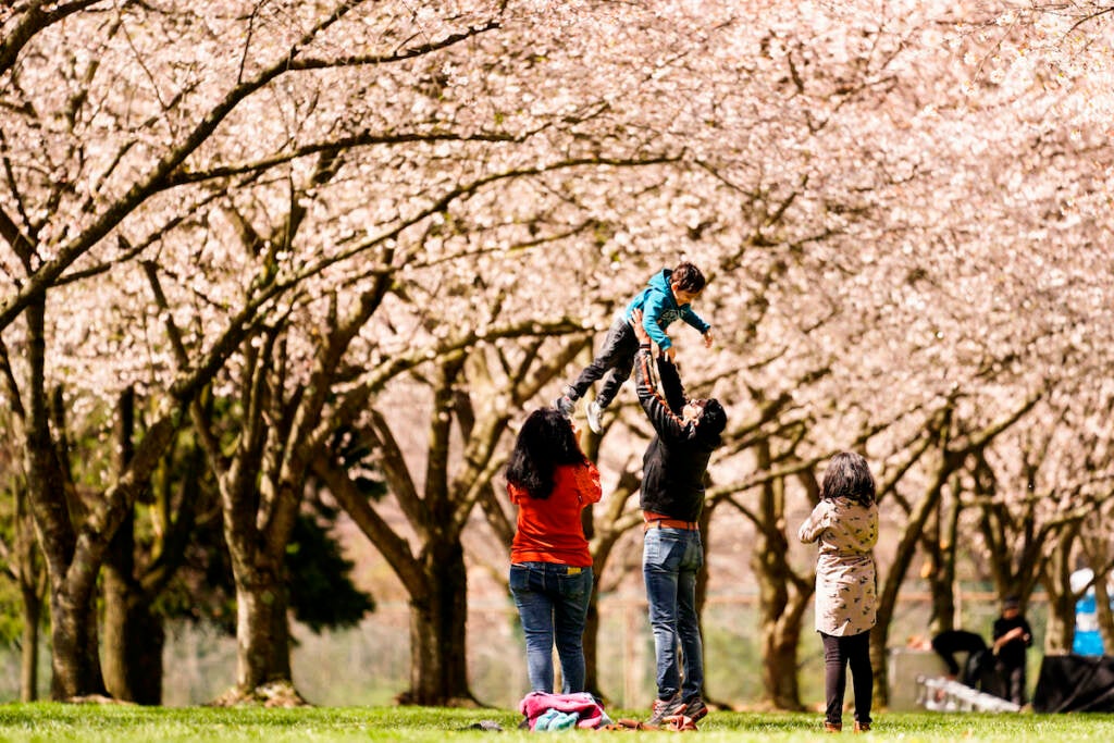 People photographs beneath the cherry blossoms at the Fairmount Park Horticulture Center in Philadelphia, Friday, April 8, 2022. (AP Photo/Matt Rourke)
