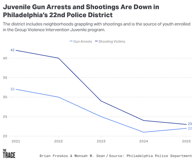 City records indicate that at least 223 juveniles have been shot in the 22nd District since 2015, the highest total of any Philadelphia police district during that period. But the violence has been waning: In 2021 — the city’s most violent year on record — 42 juveniles were shot in the 22nd, compared to 22 last year. The number of youth arrested for gun crimes has also fallen, from 32 five years ago to 22 in 2025.