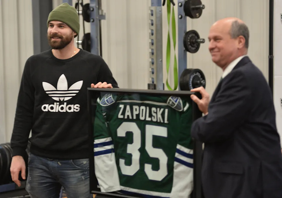 Team USA goaltender Ryan Zapolski, at left, and Mercyhurst men’s hockey coach Rick Gotkin retire Zapolski’s uniform number during a news conference following a workout at the Mercyhurst Ice Center at Mercyhurst University in Erie on Feb. 1, 2018. Zapolski, an Erie native, Cathedral Prep and Mercyhurst University graduate, was working out in Erie for a few days before joining the Team USA hockey in Pyeongchang, South Korea, for the 2018 Winter Olympics. Olympic spotlight