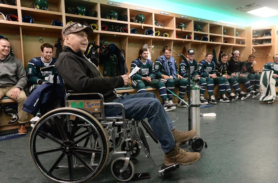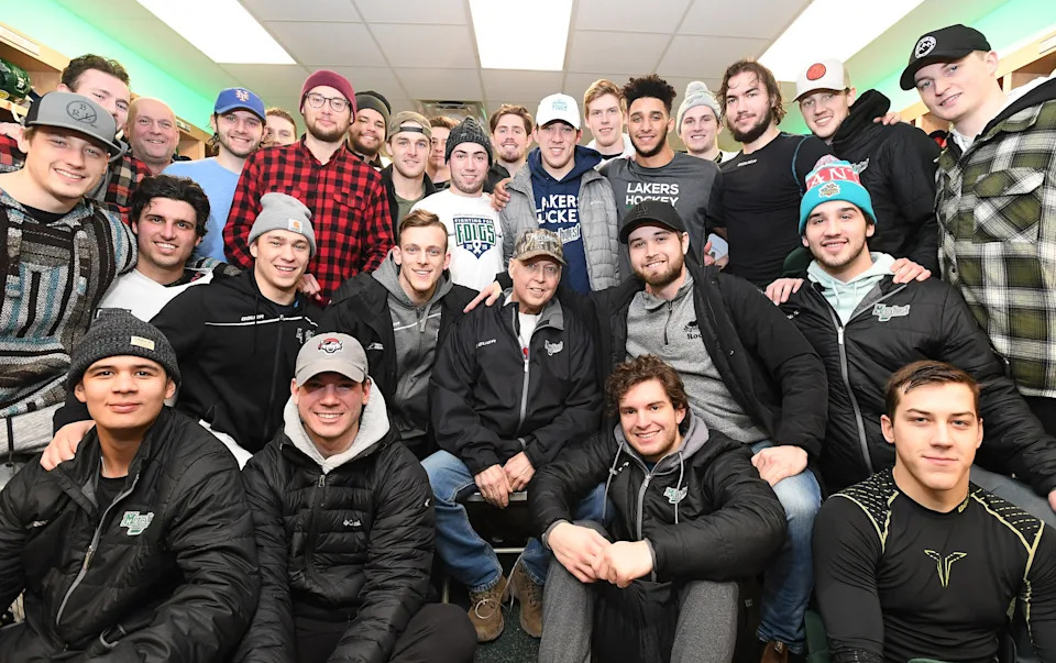 Mercyhurst University men’s hockey players surround Mike Folga, seated at center, during Folga’s visited the team’s locker room at the Mercyhurst Ice Center at the university’s Erie campus on Jan. 14, 2019. Folga, 63, had stage IV leiomyosarcoma, a rare form of smooth muscle tissue cancer that was discovered in his groin, Folga worked as an equipment manager and trainer in the NHL in the 1980s and 1990s and has been the Mercyhurst men’s equipment manager since 2000.