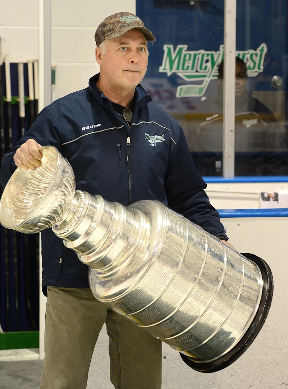 Mike Folga, head athletic trainer and equipment manager for the Mercyhurst University men’s hockey team, carries the Stanley Cup onto the ice at the Mercyhurst Ice Center before their game against Bentley on Feb. 1, 2014. Folga was a trainer with the New York Rangers in 1994 when that team won the Stanley Cup.