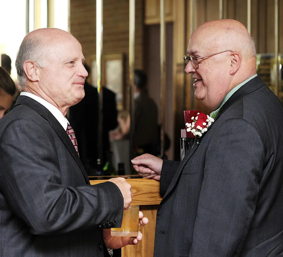 Mercyhurst Athletic Director Joe Kimball, left, and John Leisering talk during the Erie Metropolitan Chapter of the Pennsylvania Sports Hall of Fame induction dinner and ceremony at the Zem Zem Shrine Club in Millcreek Township on June 21, 2011. Leisering was inducted into the hall of fame. Leisering was sports information director for Mercyhurst College for 25 years and worked primarily with the school’s men’s and women’s hockey program, becoming the familiar voice of the program on radio broadcasts. Leisering named Sportsman of Year for many contributions to Erie sports