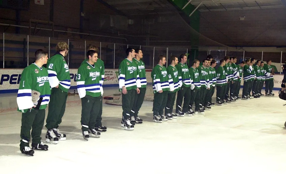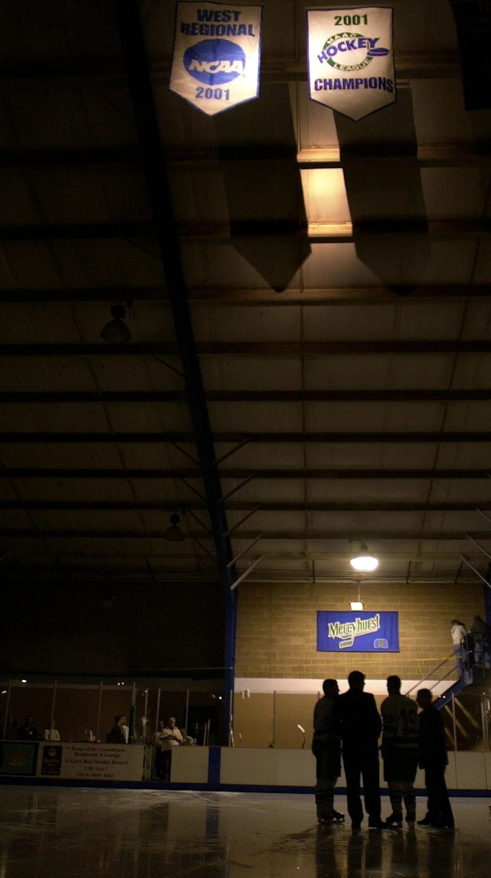 Mercyhurst College Hockey players stand beneath the new banners commemorating their 2001 MAAC championship and NCAA West Regional berth during the pregame ceremony at Mercyhurst Ice Center on Oct. 9, 2001. The Look Back: March 25, 2001