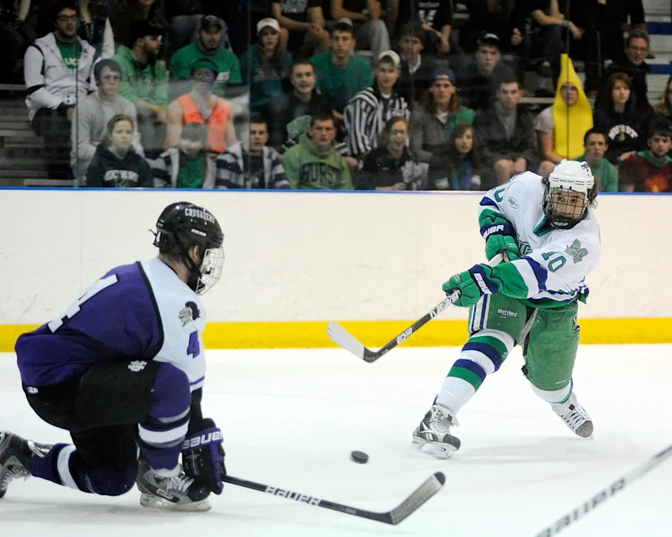 Mercyhurst University’s Nardo Nagtzaam, shoots against Holy Cross defender Mike Daly during the first period of the Atlantic Hockey Association quarterfinals at the Mercyhurst Ice Center in Erie on March 11, 2012.