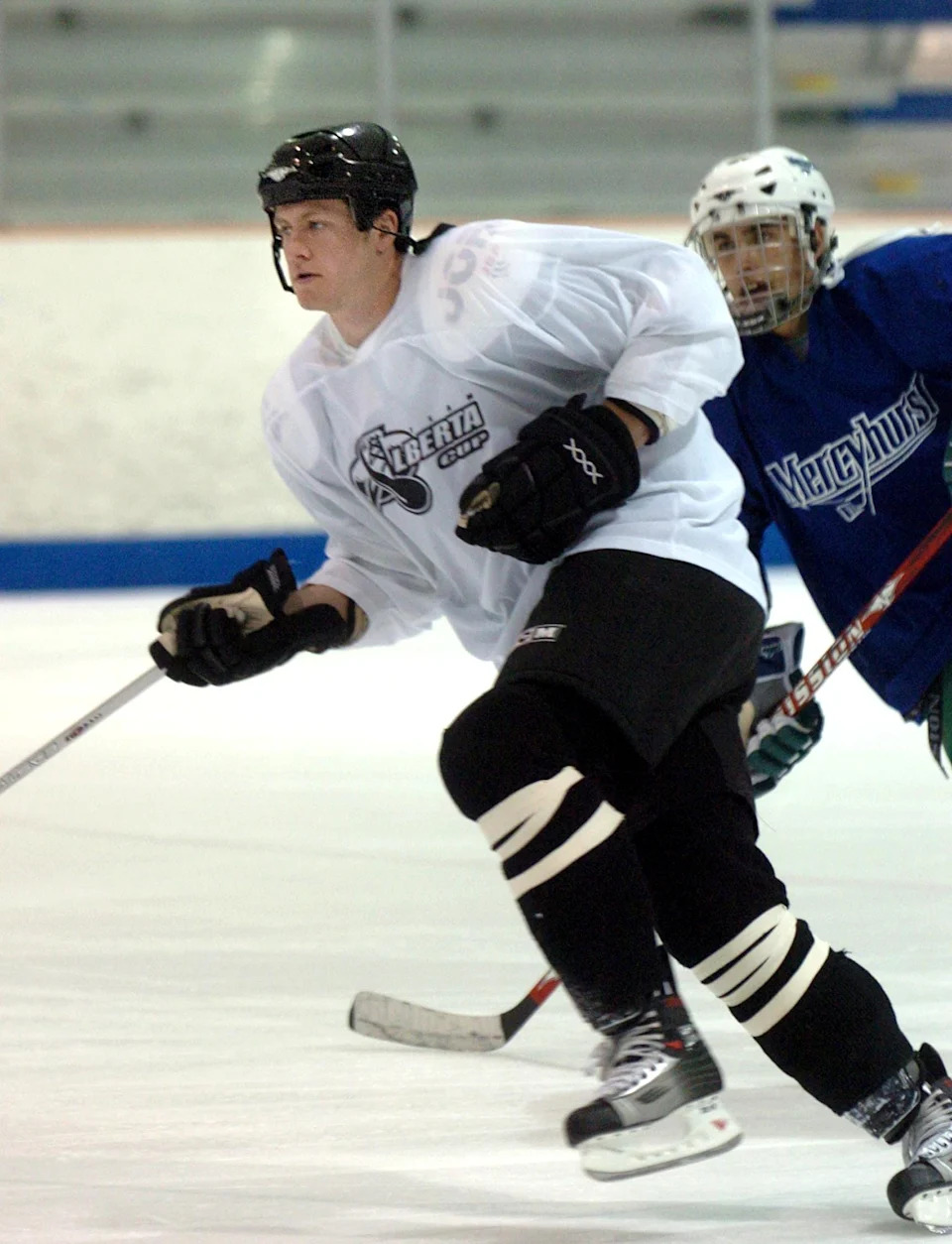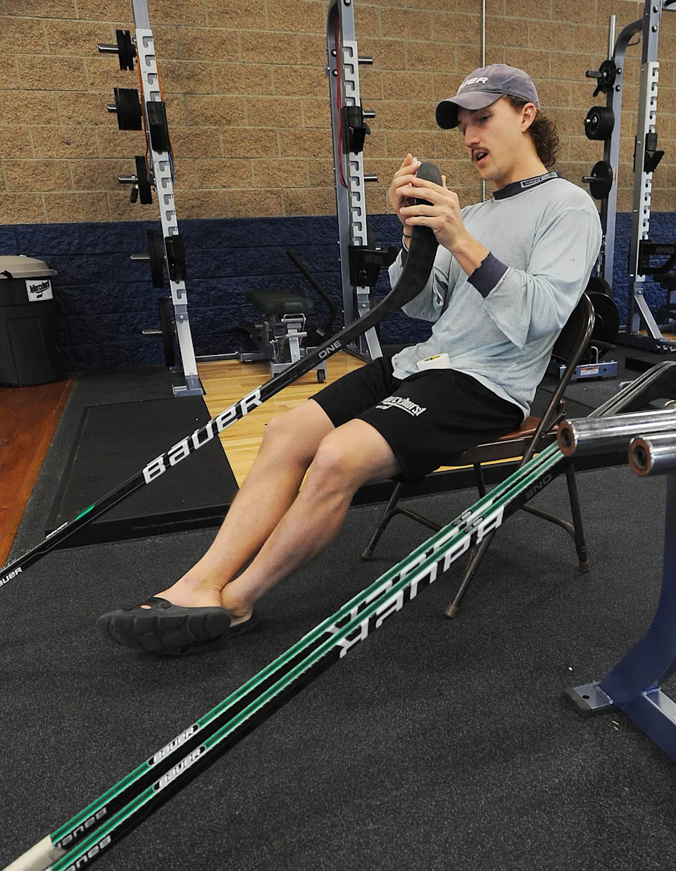 Former Mercyhurst College hockey player Jamie Hunt, works out at the college’s Ice Center.
