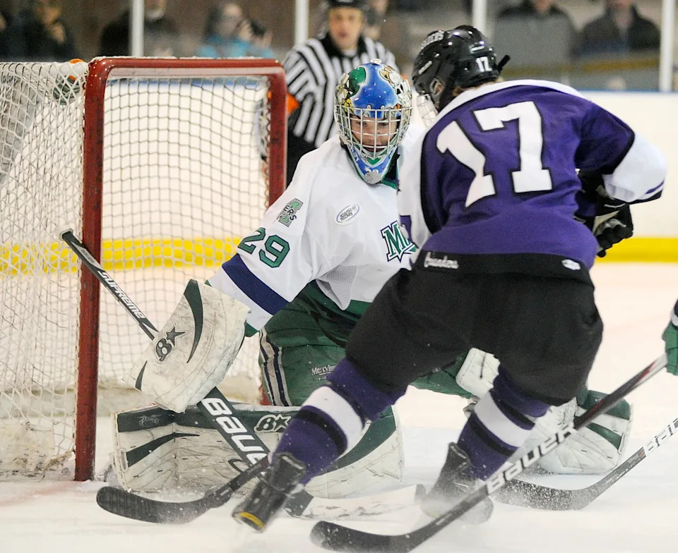 Mercyhurst College goalie Ryan Zapolski waits in the cage during a game at the Mercyhurst Ice Center against Holy Cross on Jan. 15, 2011.