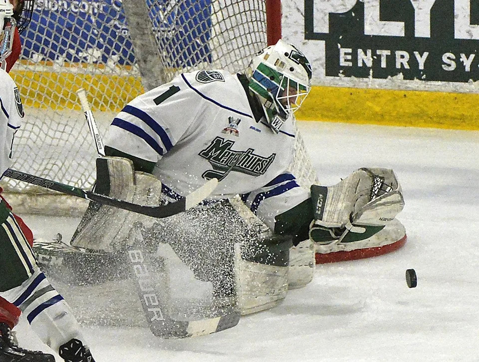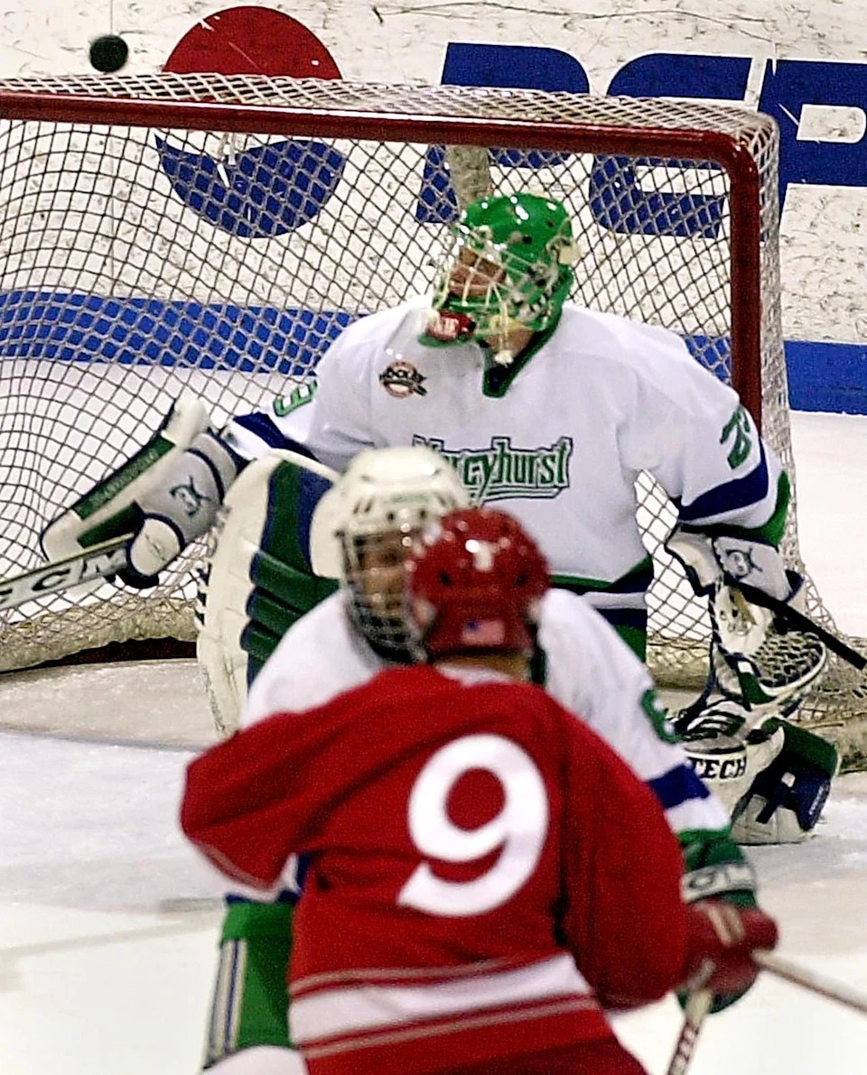 Mercyhurst College goalie Andy Franck stops a shot by Sacred Heart’s Peter Giatrelis in the first period at the Mercyhurst Ice Center in February 2003.