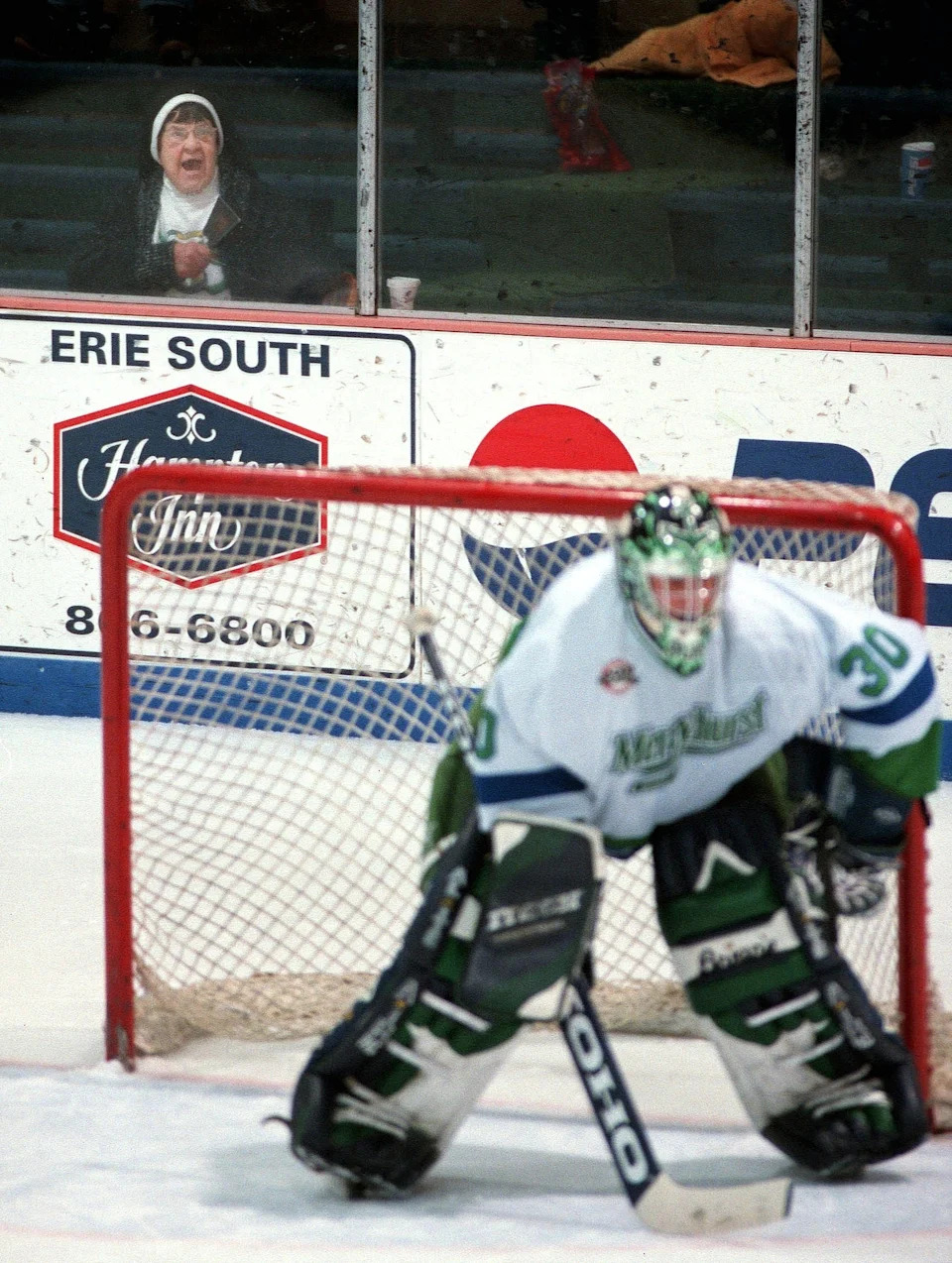Sister Mary Damien Mlechick, RSM, cheers on her beloved Mercyhurst College hockey team against Bowling Green in December 2000 at the Mercyhurst Ice Center.
