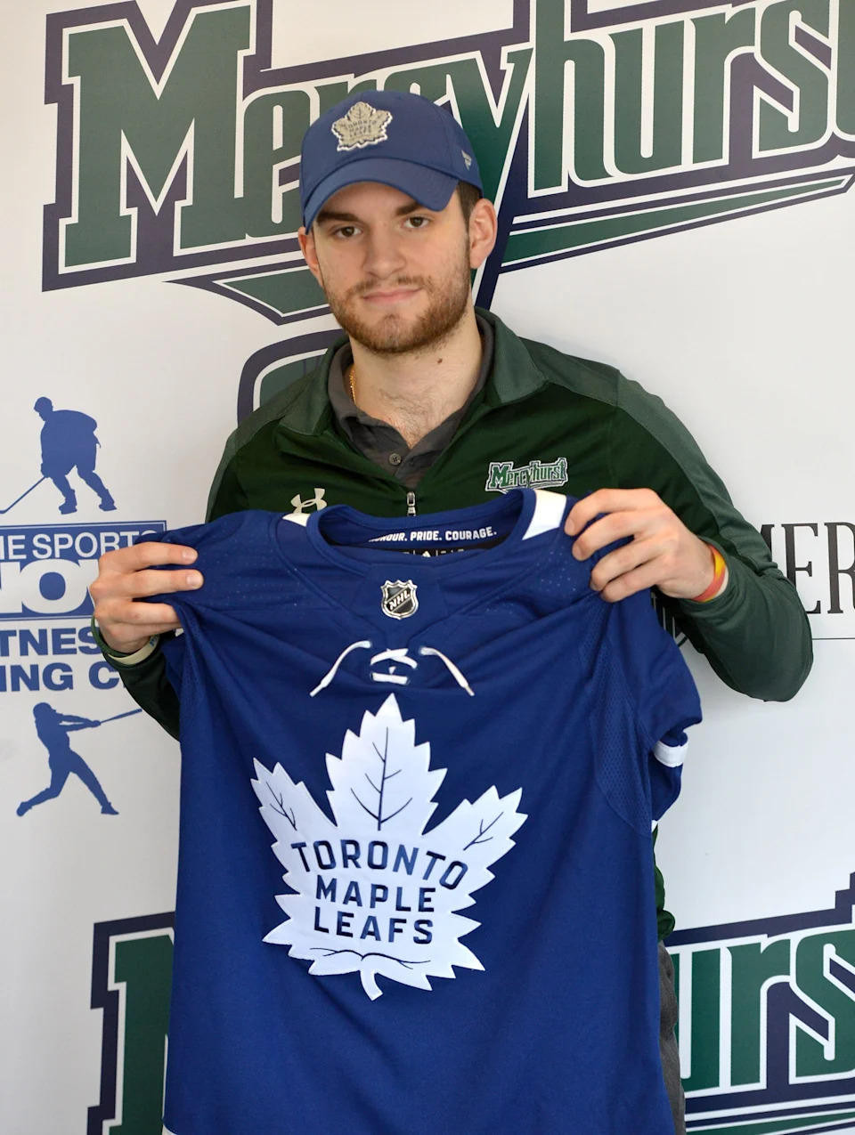 Mercyhurst University hockey player Joseph Duszak shows off a Toronto Maple Leafs sweater March 13 at the Mercyhurst Ice Center after signing a two-year contract with the Toronto Maple Leafs effective beginning in the 2019-20 season. He was the seventh Mercyhurst player to sign an NHL contract. Mercyhurst’s Duszak signs with Maple Leafs