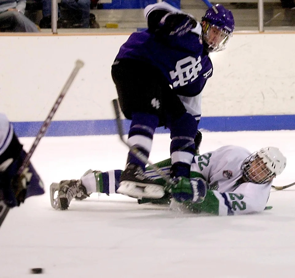 Mercyhurst College’s P.J. Hiscock beats Bernie Chmiel of Sacred Heart to the puck at Mercyhurst Ice Center in February 2003.