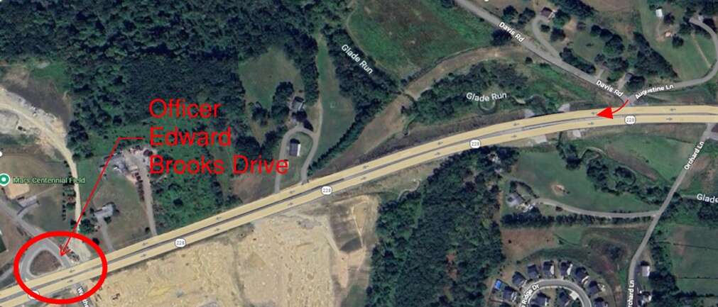 A map view of the Davis Road and Officer Edward Brooks Drive exchange. Instead of turning left on Davis Road, PennDOT is changing traffic patterns. Drivers will head westbound to the jughead before using it to turn around and head eastbound on Route 228. Submitted