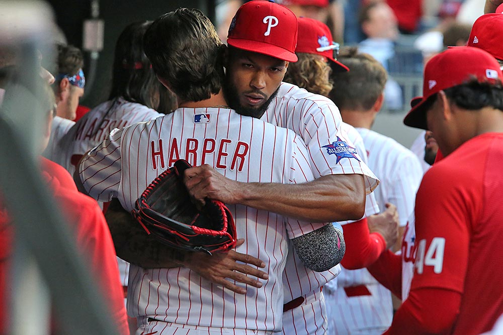 Bryce Harper congratulates Sanchez. Photo: Webster Riddick