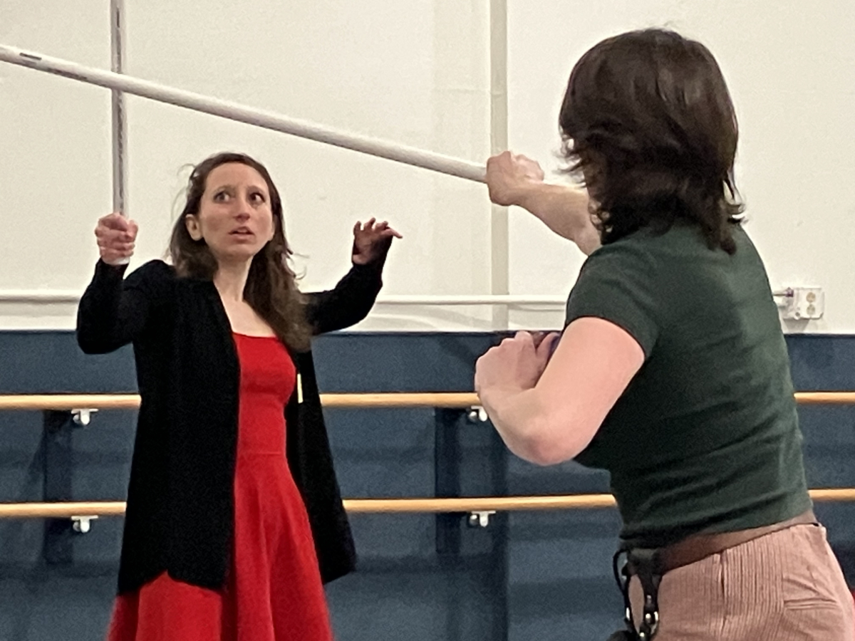 Pier Players Theater Company co-founder Chelsea Cylinder (left) spars with co-founder Julianne Kastner during rehearsal for I Think We’re Lost. Photo/Mark Zimmaro