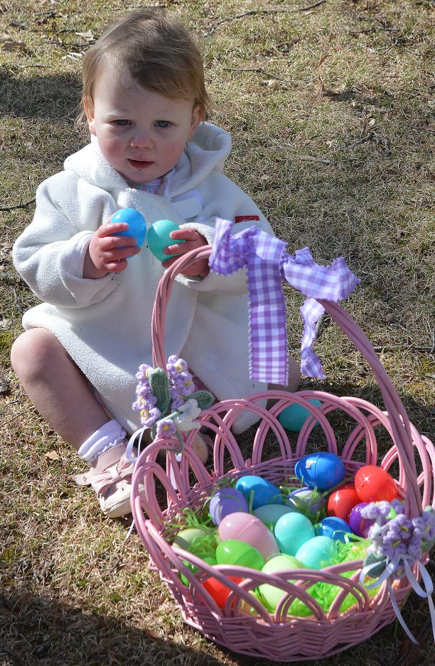 Barringer Swent, 15 months, presses two eggs together before placing them into her basket at the Mt. Lebanon Easter Egg Hunt.