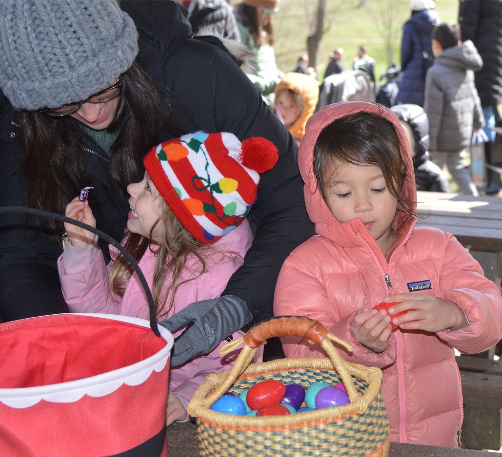 Some 500 eggs were scattered throughout an area in the park roped off by tape and divided by age groups. After a 10-second countdown, kids aged 7 and under along with their parents and guardians ripped through the paper barrier and scurried up the hill to fill their baskets. An additional 500 eggs were hidden inside the recreation center for a special hunt held March 31 on the ice rink.
