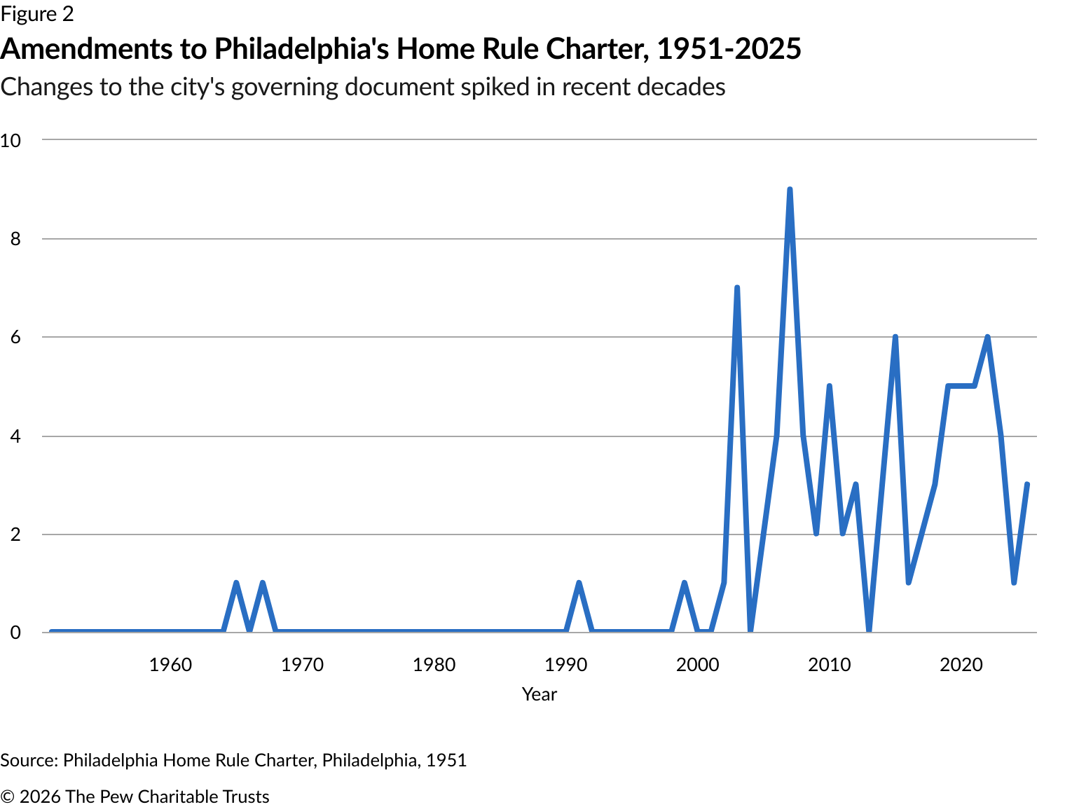Historically, charter changes represent an opportunity for voters to shape the document that guides how they are governed. In the five decades following its adoption, Philadelphia’s charter was amended only four times. But since the early 2000s, dozens of amendments have been passed, with one—sometimes more—moving forward almost every year.22