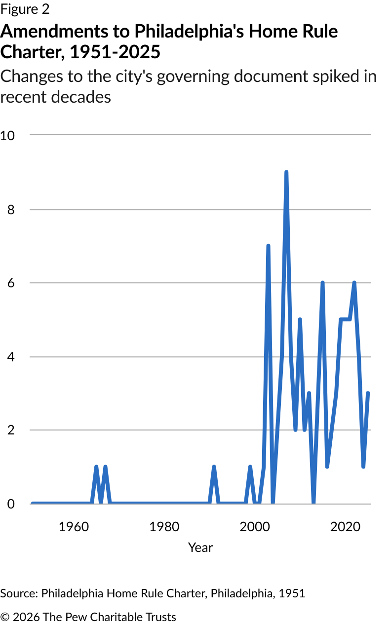 There have been more than 80 amendments to Philadelphia’s charter since 2000, two dozen of which have come in just the last five years. The amendments have covered a broad range of issues, from changes to the structure of the government, to the delivery of social services, to efforts to create greater fiscal stability.