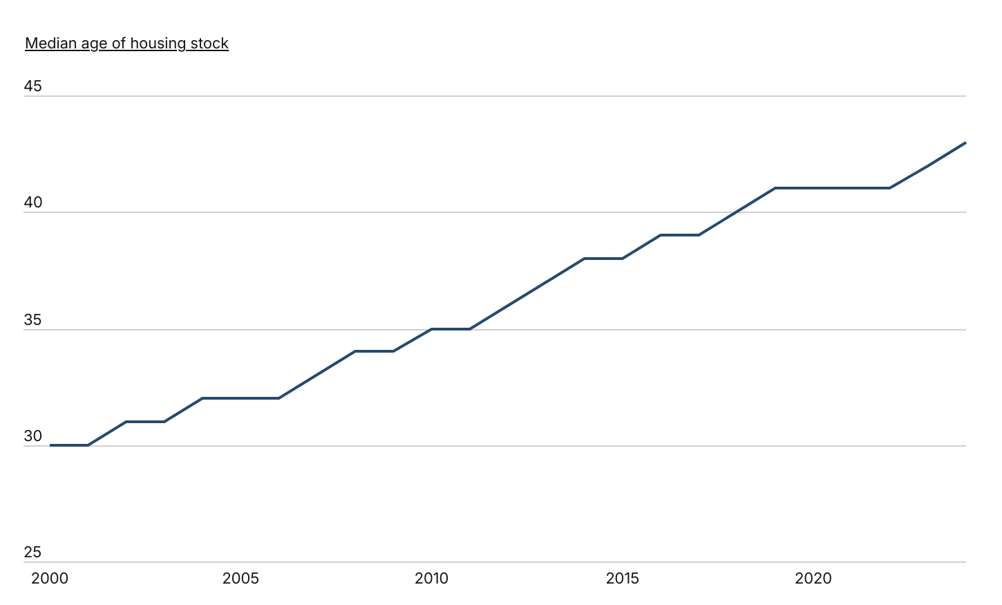 With fewer new homes coming onto the market, many buyers are increasingly competing for older homes. Over the last two decades, the median age of a home in the U.S. has increased by more than 10 years, from 30 years in 2000 to 43 in 2024.