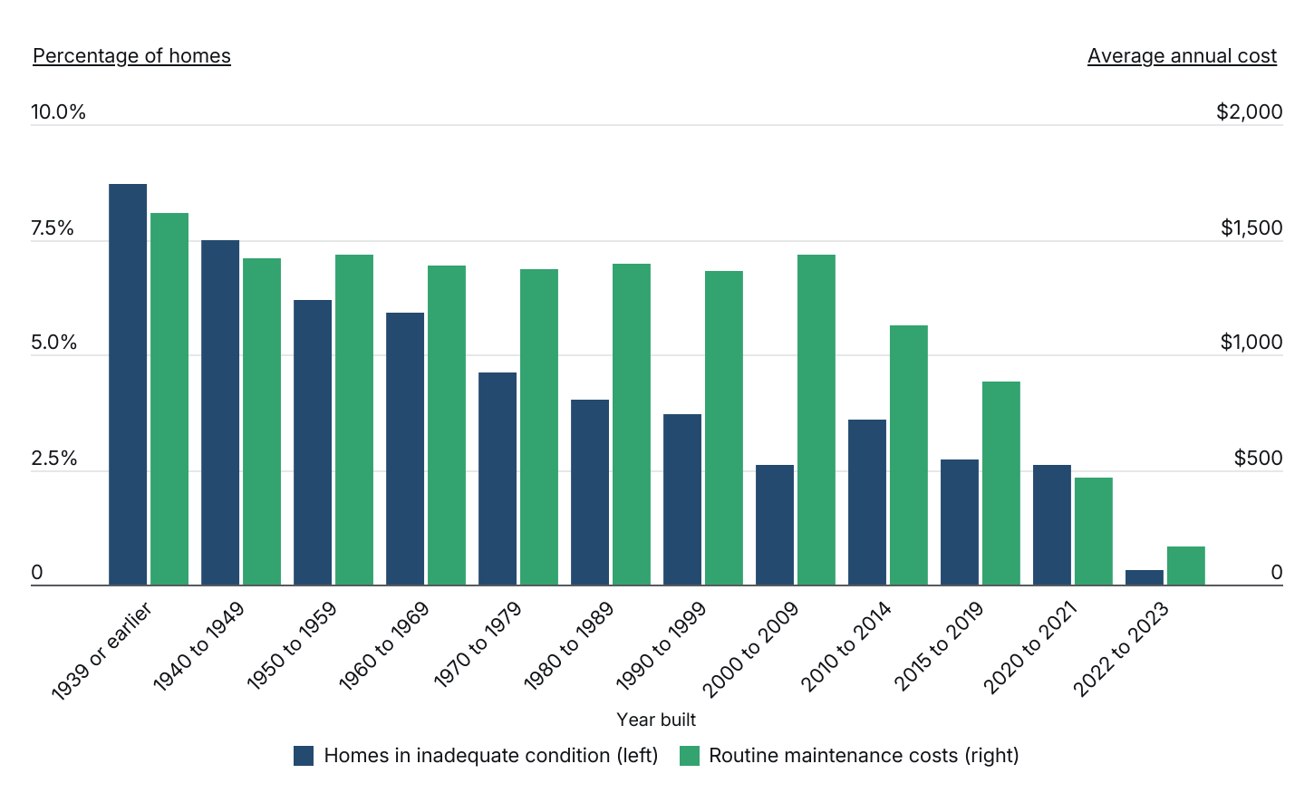 The downside of older homes, of course, is that aging homes often come with additional costs for maintenance and repairs. According to data from the U.S. Census Bureau, both the likelihood that a home is in inadequate condition and the typical costs of routine maintenance increase with age. Of U.S. homes built before 1940, 8.7% are considered to be in inadequate condition, as opposed to just 0.3% of homes built since 2022. Meanwhile, the average annual maintenance costs for homes built before 1940 are $1,615, compared with just $164 for homes built after 2022—nearly 10 times higher.