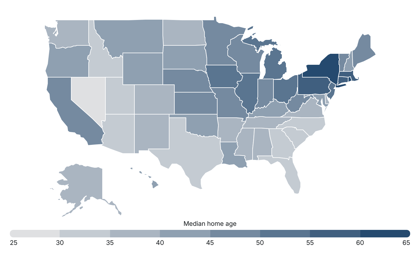 U.S. housing stock continues to age. The median age of U.S. homes has consistently risen since the turn of the century and reached 43 years in 2024.Historic charm means more home maintenance. Homes built before 1940 are nearly 30 times more likely to be in inadequate condition and cost nearly 10 times more in routine maintenance than new homes built after 2022.The Northeast is the epicenter of aging properties. Buyers in New York State face a national-high median home age of 65, a stark contrast to Sun Belt states like Nevada, Arizona, and Texas, where the median age sits at 30 years or less.The new construction gap. More than a quarter of homes in older metros like Buffalo and Boston were built before 1940, while booming cities like Austin and Raleigh are driven by new development and boast median home ages of 19 and 22 years, respectively.The Age of America’s Housing Stock