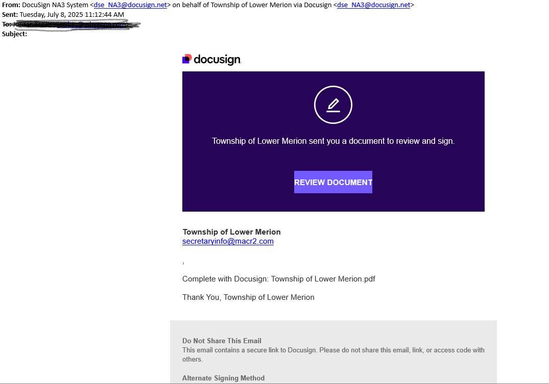 The emails ask targets to “Review Document” with the message, “Complete with Docusign: Township of Lower Merion.pdf.”