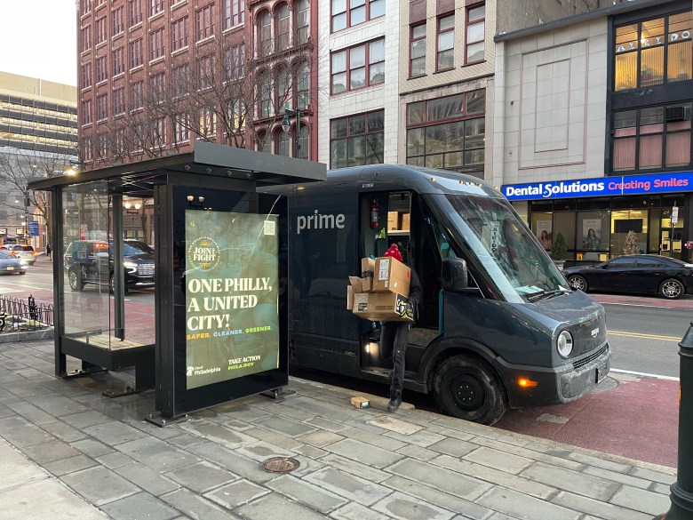 An Amazon driver blocked a SEPTA bus stop on Market Street while he delivered packages. Jan. 9, 2025. (Meir Rinde/Billy Penn)
