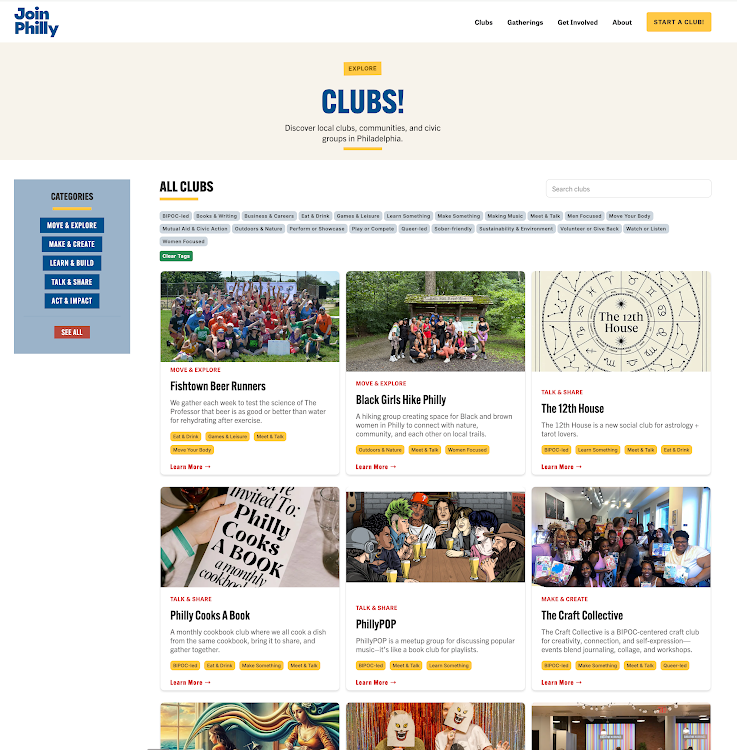The website offers a number of different club options for Philadelphians to chose from. (Photo courtesy of Join Philly)