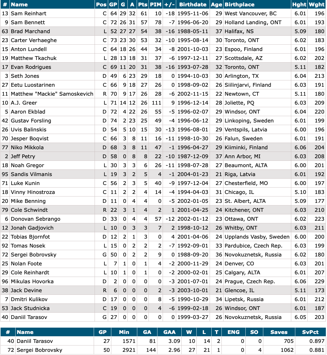 Goalies: Sergei Bobrovsky, Daniil Tarasov