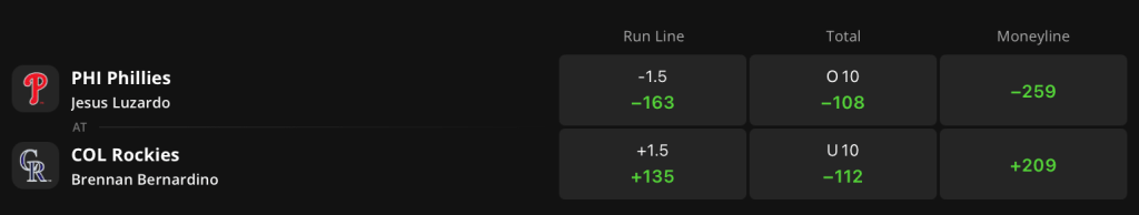 The Phillies enter a 1.5-run favorite with -259 moneyline odds on DraftKings Sportsbook, while the Rockies sit as a +209 underdog. The run total is set at 10 runs.