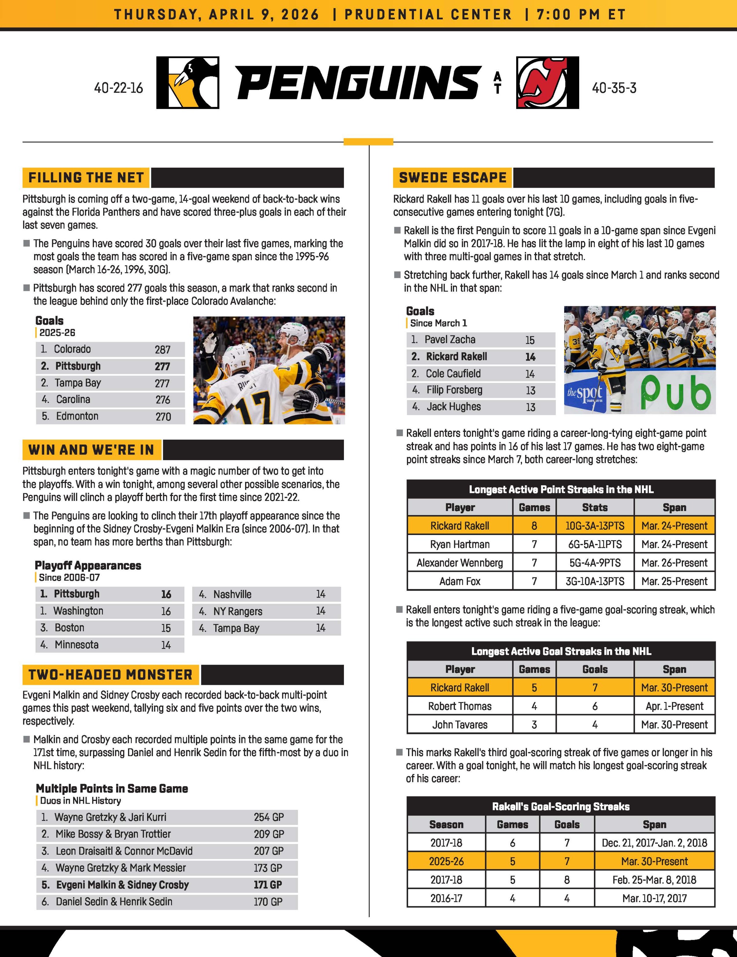 Season Series: The Penguins hold a 2-0-1 record against NJ this season, losing the first meeting in a shootout (2-1) way back on November 8th, followed by two matching4-1 Pittsburgh wins on January 8th and February 26th.