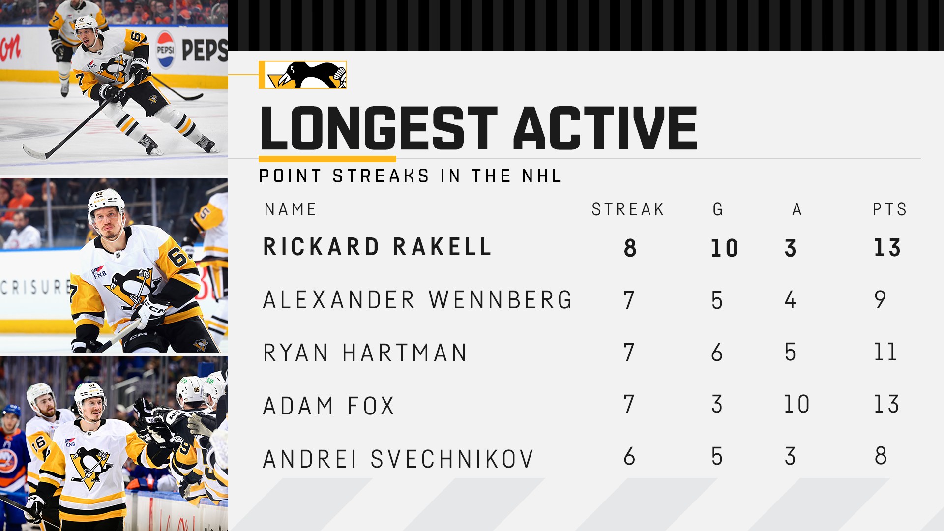 Pens’ Path Ahead: The home stretch of the regular season is here! The Pens kick off four-games-in-six days to wrap up the season, heading home on Saturday for fan appreciation day on the home finale against Washington (3:00pm start) then head down to the Capital City for a 3:00pm Sunday rematch. Then Game No 82 is Tuesday night in St. Louis.