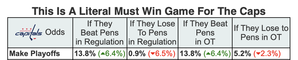 Opponent Track: The Philadelphia Flyers’ loss to the Detroit Red Wings on Thursday night didn’t just help the Pens clinch home ice advantage— it also kept the Capitals’ hopes of sneaking into the third spot in the Metro alive. The Caps have a path to the postseason if they can win out their final three games, starting with this back-to-back set against the Pens, as long as the Flyers, New York Islanders and Columbus Blue Jackets keep losing. If the Caps lose today to the Penguins, however, their playoff odds drop to next to nothing. Per MoneyPuck:
